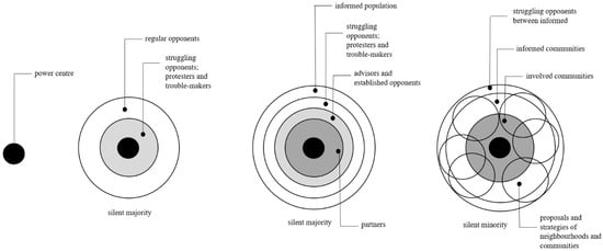 Since Arnstein [] came up with a one-dimensional analogy of the ladder, the practice of participation has changed considerably, and many scholars document that it has progressed to the highest steps []. Participation is mainly deepening through the involvement of local communities and neighborhoods []. With the institutionalization of local communities, the concept of co-creation [] and co-design appears [,,], which refer to a highly collaborative form of planning with the wider involvement of local communities that directly specify a development plan in an open innovation process [] and, followingly, participate in its implementation [,,].