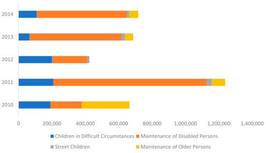 More recent studies on Zimbabwe’s urban ageing prove that the narrative of older people living in urban areas has not made any significant strides from the past. Most older people are still found to be working longer [49], living in poorer conditions with little care and support [50,51], and experiencing significant barriers in the urban space such as accessing healthcare and transportation [35]. There is increasing research on an older person’s health and well-being and the intersections with urban space. A cross-sectional survey by [52] on social support and institutionalisation in Bulawayo found most older people were at risk and experiencing poor mental health within care homes. Research by [53] on older people in an urban district in Harare, found that older people were excluded from certain activities in urban areas such as key information, education, and communication campaigns for HIV and AIDS because they are incorrectly regarded as sexually inactive and not susceptible to contracting sexually transmitted infections. Systematic evaluations of social security provisions in Zimbabwe over the past two decades describe consistent experiences of old age under persistent poverty and resource constraints [50,54,55]. The social assistance programs and maintenance of older persons in specific have been negatively impacted by the weak performance of the economy. It is a situation that has persisted for many years as shown in Figure 2 which illustrates the significantly low provision of maintenance of older persons when compared with other groups [56,57]. Contrary to the persistent narrative of marginalisation of Zimbabwe’s older urban citizens, are findings from studies indicating the valuable roles that older people, particularly older women play in urban communities such as through community building programmes [58,59], crucial caregivers and family contributors [55,60,61], sharing knowledge and building symbiotic relationships between older persons and their families [62].