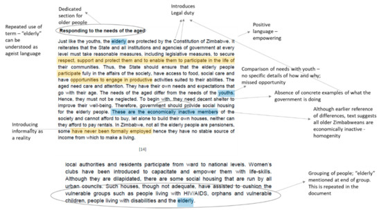 The search engine Google was used to locate websites operated by the Government of Zimbabwe, ministerial bodies, and Non-Governmental Organisations involved in sustainable development and the promotion of inclusive communities. Targeted searches were conducted for documents through snowballing, identifying publications in reference lists, and expert recommendations. For ease of review, the publications were grouped into four main categories: first, policy documents and strategies produced by the Government of Zimbabwe and government departments (no = 17); second, a national review for Sustainable Development Goals (SDGs) and the progress reports produced by the Government for the Millennium Development Goals committed to at the Fifty-Fifth Sessions of the United Nations General Assembly in September 2010 (no = 6); third, periodic review reports and key documents reflecting national priorities and interventions authored by the Government for the United Nations and African Commission (no = 8) and, lastly, papers and research reports published by Non-Governmental Organisations working on the improvement of the lives of Zimbabwean citizens including reports focused solely on older persons (no = 14). NVivo 10, a well-known qualitative data analysis software tool, was used to help the systematic storing, retrieval, evaluation, and interpretation of the texts. A key aspect of the analysis was to examine the “form” and “texture”, the relations between the elements of the text as well as its characteristics including language and style. An example of these aspects of the analysis is presented in an Excerpt from the 2015 National Report for Habitat III in Figure 3. Further information on the content of this document is given in the discussion sub-sections. Figure 4, Figure 5 and Figure 6 give further details about the selected documents and the word frequency results.