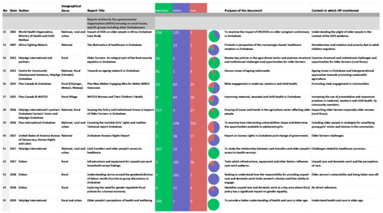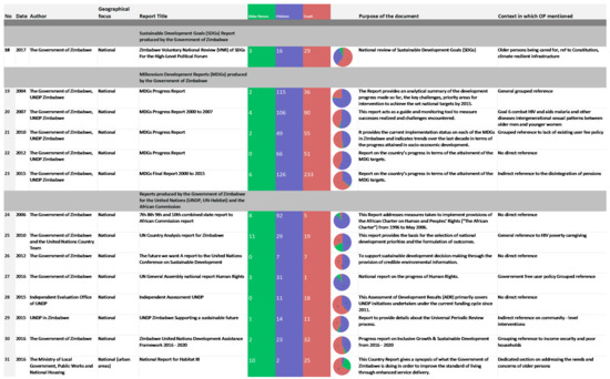 Older persons are referred to indirectly in groupings such as “the disadvantaged”, “the poor”, and “the vulnerable” (example in Figure 3). While there was no evidence to suggest that older people have been included in any of them, no definition of who is/was encompassed by these terms was given either. An illustration of this style of writing is shown in Excerpt (1) below from the Zimbabwe National HIV and Aids Strategic Plan (Figure 4, no. 3), which discusses mitigation efforts for households. Older person headed households are not included in the plans for mitigation despite evidence-based research suggesting the existence of such structures as a result of the HIV/AIDS epidemic [63]. Another dimension of exclusion is displayed through the level of participation and consultation for the development of the documents. Aside from the reports solely focused on the issues of older people (Figure 6), the mention of older persons is minimal across the sample. In some cases, a list of groups and persons consulted in the production of the reports is included, however, in general, no explicit reference to older person groups is mentioned. An example of this lack of engagement with senior persons is evident in Excerpt (2) taken from the 2017 Zimbabwe Voluntary National Review of Sustainable Development Goals (Figure 5, no. 18). Surprisingly, some documents with a large focus on older persons such as the Social Security Policy only mentioned one person out of 84 representing older people. This lack of representation is despite consistent rhetoric within the document championing inclusive consultation (Excerpt 2). Several documents such as the National Healthy Ageing Strategy displayed a robust list of participating organizations during the strategy development process. Although noticeably organisations representing less visible older persons, such as older people living in informality and disabled older people, were not explicitly mentioned.