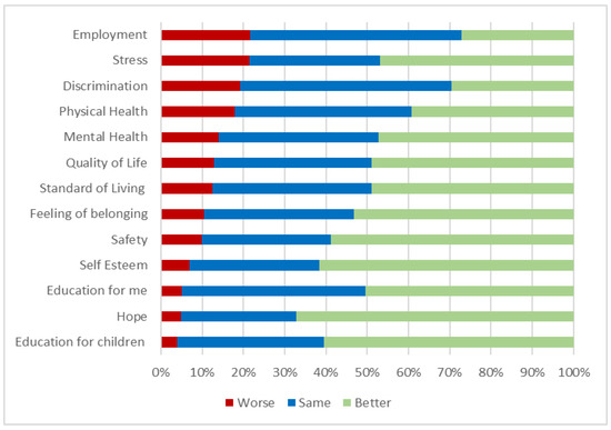Participants reported both positive and negative aspects of AH (Figure 1). Most tenants indicated that moving into AH led to less financial strain (51.5%, 95% CI: 43.8–59.2%). Moreover, 26.8% of respondents reported having more money since they moved into affordable housing (95% CI: 19.7–35.4%). Participants also reported positive impacts on their self-esteem, hope, feelings of safety, and education for their children. Approximately one-third of individuals said their employment had improved since moving into affordable housing. Furthermore, when looking at other non-housing outcomes of affordable housing, we found that approximately half of the tenants reported having improved quality of life, standard of living, and feelings of belonging. Conversely, 11.8% of the respondents (95% CI: 7.6–17.8%) reported that they were more stressed after moving into affordable housing. In addition, less than half of participants reported that their physical or mental health had improved since moving into affordable housing.