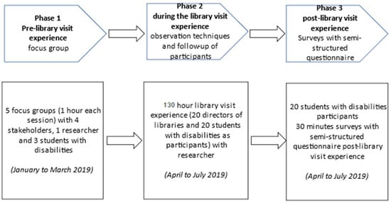 With this research project we set out to accomplish two aims: first, to explore which critical encounters in the library experience generate the best value for students with disabilities living in Girona and, second, to aid library managers in allocating their resources properly to remove any prevailing barriers. To this end, the research project was split into three phases: in Phase 1 we held five focus groups; in Phase 2 we applied ethnographic techniques on 5 library visits with 20 students with disabilities and 20 library managers; and in Phase 3 we administered a post-visit experience survey to the 20 participants with disabilities. The official institutional ethics approval number is Girona Provincial Council exp-P170000A. Figure 2 below shows the project design breakdown and timeline.