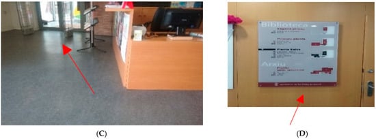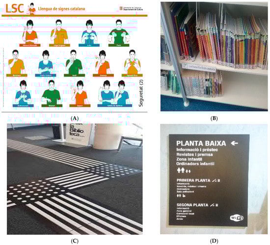 (A) Sign language displayer for library staff implemented in all the libraries. (B) Acquisition of a huge portfolio of books in plain language for students with intellectual disabilities. (C) Podotactile bands implemented in libraries for blind students. (D) Signage posting adapted to Universal Design standards to the communication needs of users (plain language, contrasting colours, etc.).