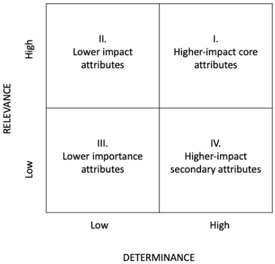 The value and the evaluation of the attributes relate to attribute classification. Previous research proposes the relevance-determinance analysis model (Figure 2) for classifying attributes [22,23,24]. This classification is essential in order to analyze the type of attributes that can attract visitors, as previously explained regarding the study of Oriade and Schofield (2019). Mikulić and Prebežac [22] propose this model for interpreting the perceived value of attributes, considering two dimensions: relevance and determinance. The model is a tool designed as an alternative to importance-performance analysis [24]. It aims to address the shortcomings of other similar tools by offering a multidimensional perspective. The model is a quadrant comprising four different levels of relevance and determinance. The first consists of “higher-impact core attributes”, which have a great responsibility in decision-making and the consumer experience, and the second represents “lower-impact core attributes”, which are essential for decision-making but less so for the consumer experience. The third highlights “lower-importance attributes”, stressing that it is not that these attributes lack interest, only that, compared to the rest, they present a lower value from the consumers’ point of view. In the fourth, “higher-impact secondary attributes” have been identified that have a low relevance but high determinacy, being part of the so-called “augmented product”, and which, therefore, affect the consumers’ experience [24]. This model is interesting when extrapolated to museums, to identify the relevance of museum attributes.