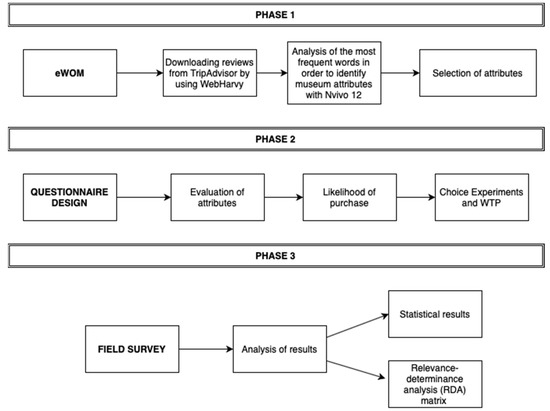 The proposed methodology (Figure 3) is divided into three phases. First is the detection of the attributes of the Thyssen-Bornemisza National Museum through eWOM, derived from TripAdvisor. Previous studies analyzed TripAdvisor reviews to learn in depth the opinions and perceptions of the users [24,56]. Second, we developed a survey considering the previous identification of attributes of the museum as perceived by tourists, through a TripAdvisor analysis of eWOM [17]. Linburd et al. [57] suggest that sustainability is linked to co-design strategies, and so the local community’s participation and that of tourists are crucial to this study. Thus, during this phase, a questionnaire to tourists and residents of Madrid was designed to evaluate those attributes previously detected by applying willingness to pay and choice experiments. The previous attribute detection allowed us to introduce a more critical approach to the questionnaire and avoid a bias in questionnaire design. The questionnaire distribution and the analysis of results are conducted during the third phase. A detailed description of each phase is presented below.