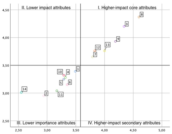 After a preliminary analysis of the data obtained regarding the assessment of the attributes, it was possible to apply the relevance-determinance analysis (RDA) model to our results [22,23,24]. The matrix (Figure 4) shows two types of attributes: higher-impact core attributes (A3, A7, A8, A9, A12, A13) and lower-importance attributes (A1, A2, A4, A5, A6, A10, A11, A14). The attributes located at the point of most significant determination and relevance are the location (A8) and the building (A3). Behind these are the permanent collection (A9) and temporary exhibitions (A13). These attributes are perceived as more important when making visit decisions by museum visitors and have a significant influence on the visitor experience. Therefore, they are vital attributes to be considered in the performance of the museum and the establishment of improvement strategies. As for the lower-importance attributes, the ticket price (A14) is the attribute with the lowest relevance-determination. Next, there is the app (A2) and the so-called queue attribute (A11). These attributes present a minor relationship between relevance and determinance, which means that they are less essential attributes regarding choice and have less influence on the visitor experience [24].
