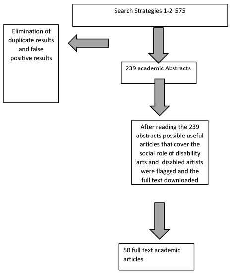 Of the 575 abstracts found through the search strategies, 239 remained after duplicates between databases and false positives were removed. False positives were mostly in EBSCO-HOST due to the problem with the EBSCO-HOST search engine that does not search phrases such as “art* with a disability”, as it does not recognize “with” or “a” in a phrase. Thus, one obtains the terms “art*” and “with” and “a” and “disability” in an abstract whereby in some abstracts, the actual phrase might be present, but others might simply contain all the words with no correlation to each other. Within these 239 abstracts, the main theme was linked to disabled artists and their work as artists (i.e., how the work is done, interpretation of the work, promotion of work, and the creation process), and as such were not eligible for the downloading of full articles as the focus was not on the social role of disabled artists and their work and did not cover a linkage between disabled artists, their work, and science and technology. We downloaded 50 full-text articles that, based on the abstracts, could have more details on the societal role of disabled artists and their work and could cover a linkage between disabled artists, their work, and science and technology.