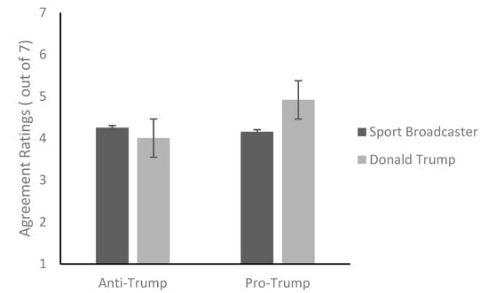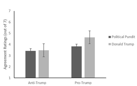 Both significant main effects were qualified by significant two-way interaction effects. The Trump Support × Source interaction was significant, F(1, 382) = 4.91, ηp2 = 0.013, p = 0.027. Probing this interaction revealed that Trump supporters were more likely to agree with statements attributed to Donald Trump (M = 4.64, SD = 1.80) rather than to an anonymous political pundit (M = 3.82, SD = 1.81), 95% CIDiff [−1.32, −0.31], p = 0.007, whereas Trump detractors were not significantly affected by the source of statements, Manon = 3.42, SDanon = 1.84, MTrump = 3.48, SDTrump = 1.80, 95% CIDiff [−0.53, 0.39], p = 0.663. This pattern is consistent with Hypothesis 1 (Asymmetric Trump Bias) and inconsistent with Hypothesis 2 (Symmetric Trump Bias), and is illustrated in Figure 1.