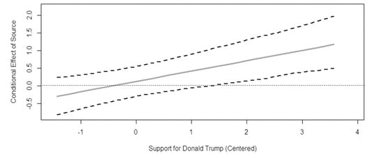 In addition, those who are concerned about whether these effects specifically regarding Trump support generalize more broadly to typical liberal/conservative political bias should know that Trump support and self-reported political orientation were very highly correlated, r = 0.762, p < 0.001. A parallel exploratory PROCESS Model 1 analysis with political orientation as the moderating variable revealed a significant Source × Political Orientation interaction, b = 0.19, 95% CI [0.00, 0.380], p = 0.047. Probing this interaction demonstrated that the effect of the source manipulation on agreement ratings was significant at the 50th percentile of political orientation and higher.