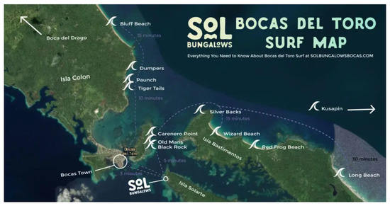 While studies show that surfing tourism accounts for one-quarter of all visitation to neighboring Costa Rica [40], Surfing tourism has not been empirically researched in Panama. Surf tourism, however, represents a large niche and is a substantial economic driver in Bocas [41]. There are seven surf schools and/or board rental places, two board shapers, five dedicated surf transport businesses, one all-inclusive surf resort with boat charter services, many hotels catered to surfers (increasingly developing closer to surf-breaks), surfing is listed as an activity on mostly all hotel operator’s activity pages and there is a non-governmental organization dedicated to surf and volunteer service. Surfing occurs at various locations on three of the eight inhabited islands (see Figure 1) as well as on the mainland on the Ngöbe-Bugle Comarca. Most of the surf visitation occurs between mid-December and mid-March, which is also the high season for tourism generally. In that sense, surfing in Bocas does not provide off-peak visitation stability as it was found to do in Europe [42,43] and the USA [44].