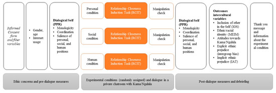 An experimental design was implemented on the Qualtrics platform. Taking advantage of the possibility of using a JavaScript code on Qualtrics, a private chatroom was programmed in which participants had to dialogue online with a fictitious outgroup member and answer a series of questions. Fictitious outgroup member’s answers were programmed based on real online intergroup dialogues provided in the study by Imperato et al. [22]. The design procedure included: an informed consent form, pre-dialogue measures, the implementation of three experimental conditions, dialogue, post-dialogue measures and debriefing. Design and measures are presented in Figure 1.