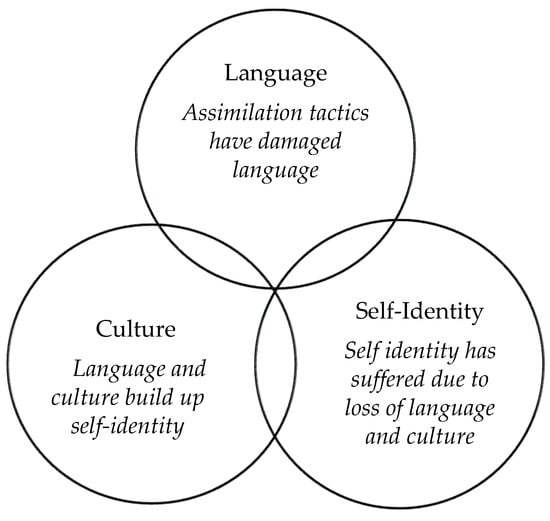 Dr. Lorna Williams, a member of the Lil’wat First Nation and holder of the Canada Research Chair in Indigenous Knowledge and Learning, emphasizes the need for immediate action. She asserts that “we don’t have much time left to document the knowledge of these languages [and] to hear their beauty” []. This sentiment is echoed by many Indigenous groups, who also recognize that loss of language leads to a loss of culture; subsequently, this results in substantial impacts on a person’s sense of self-identity []. Given that language, cultural identity, and society are undeniably interwoven, the depletion of any one of these elements often causes the deterioration of all three. Those affected often find themselves torn between two cultures, feeling lost when they do not easily fit into either []. Furthermore, a strong cultural identity is a primary and important psychosocial determinant of health and well-being for Indigenous populations [,,]. Therefore, the triad of language, cultural identity, and self-identity must be strengthened to improve the lives of Indigenous people (see Figure 1). The literature supports this relationship; it has been found that providing support to enhance Indigenous culture will result in positive mental health and coping outcomes [,].