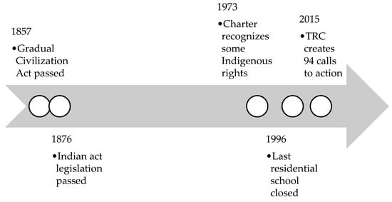 Settler colonialism in Canada began more than 200 years ago, but it persists even today. Colonialism is an ongoing system of oppression in which Indigenous people are alienated from their lands and subjected to government-sponsored programs of assimilation [,]. English and French have historically been portrayed as superior languages in Canada, whereas Indigenous languages have been characterized as “primitive” []. Indigenous languages were seen as barriers to civilization and modernity, to the extent that Indigenous men were considered “disabled” until they could demonstrate proficiency in English or French []. Such hegemonic ideologies were responsible for the highly destructive policies that have impacted Indigenous people throughout recent history []. Indigenous languages were victims of these policies, by way of the residential school system and state-imposed domination of the French and English languages []. Although there have been efforts to undo this damage, discriminatory language discourse persists in Canada, largely based on systems of power that maintain a Eurocentric narrative []. Figure 2 highlights key events in Canada’s Indigenous language history.