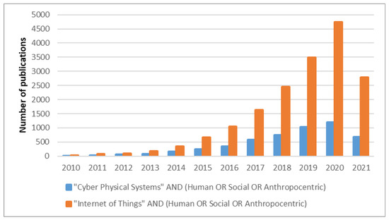 Nonetheless, these aspects have been tackled for both IoT and CPS in the last decade. Figure 1 shows the results for the searches (S1): “Cyber Physical Systems” AND (Human OR Social OR Anthropocentric) and (S2): “Internet of Things” AND (Human OR Social OR Anthropocentric). This search was performed with the ScienceDirect scientific database for practicality of use. No other database was queried, for the purpose of this search is to provide an overview of the scientific interest for the subject and not an exhaustive analysis. To obtain relevant results, the search has been restricted to articles (research and reviews), presenting the terms in their title, abstract or keywords. Hence, searches target the articles instead of only mentioning them, but for which they are the main subject (Figure 2).