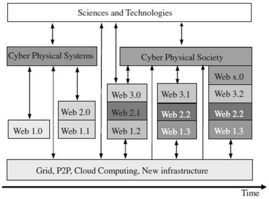 It was defined by Shi and Zhuge (Figure 12) as a ‘Cyber-Physical Socio-Ecosystem’ (CPSE) where natural physical space, social space, mental space and cyberspace interact and co-evolve with each other [59]. CPSE deals with the relationships between individuals in a cyber-physical environment and cyber-physical social system.