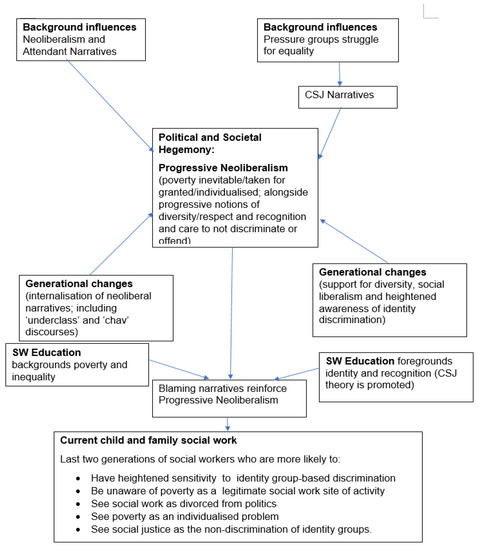 Adding evidence for younger generations’ support for culturally left ideas of recognition/identity, it appears that they have stronger values in terms of inclusion and the acceptance of diversity [35] which is very good news for social work values. However, the identity groups included in these notions of diversity—BAME people, LGBTQ+ people, disabled people, women, and transgender people—are, in Nancy Fraser’s words, seen as “deserving” in liberal society, which would again fit completely with neoliberal progressive ideology. In summary, many students support equality for those groups seen as deserving, whilst holding punitive and blaming attitudes to those who might be considered “undeserving”. This is concerning for social work, especially in practice areas where service users might be considered undeserving if viewed through a “progressively neoliberal” lens—poor people, unemployed people, substance misusers and those involved with child protection services. The next section will consider whether social work education is up to the challenge that this presents (see Figure 1).