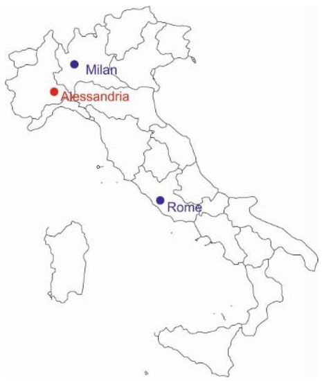 Alessandria is the thirty-seventh largest municipality in Italy (out of a total of 7904). It covers 203 km2, and has a population of around 92,000 inhabitants, with an average age of 47.5 years. The city, established in the twelfth century CE, lies on the plain created by the confluence of the rivers Tanaro and Bormida. It is an hour’s drive southwest of Milan, on the border between Piedmont and Lombardy (Figure 1). Its position has made Alessandria a fundamental military and logistical center since the eighteenth century, creating a strong interconnection between the economy of the city and those of the three largest centers of Northwest Italy (Genoa, Milan, and Turin) [25,26,27].