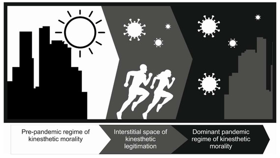 As Bourdieu [48,49] pointed out, any form of physical practice is a sociocultural action through which the individuals both embody social values and norms and reproduce and disseminate them. In this respect, any physical practice, such as jogging, refers to a regime of kinesthetic morality deeply situated in a social and historical context. As a regime of kinesthetic morality, I refer to the set of formal and informal, implicit, and explicit norms that define the meaning of physical practice and determine its public acceptability. The lockdown coincided with an abrupt shift in the regime of kinesthetic morality associated with jogging.