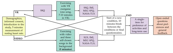 - Xu, W.; Liang, H.N.; He, Q.; Li, X.; Yu, K.; Chen, Y. Results and Guidelines From a Repeated-Measures Design Experiment Comparing Standing and Seated Full-Body Gesture-Based Immersive Virtual Reality Exergames: Within-Subjects Evaluation. JMIR Serious Games 2020, 8, e17972. [Google Scholar] [CrossRef]