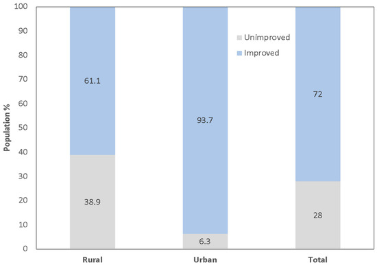 The term “toilet insecurity”, when operable toilets are unavailable [12], has been applied to encapsulate the issue of sanitation and bathroom hygiene. An environment with subpar or “unimproved” sanitation either lacks a toilet or has a toilet that does not separate human excrete from human contact. It is a bucket or a hanging toilet if not piped to a sewer system such as a septic tank [9]. A shared facility of any kind, no facilities, or usage of an open field or bush is also considered as unimproved sanitation. Improved sanitation is categorized as having a toilet connected to a piped sewer system including a septic tank or having a composting toilet [13]. It is estimated that 4.2 billion people, around 55% of the world’s population, lack access to improved and safely managed sanitation and over 494 million people practiced open defecation in 2020 [14]. According to [13], 28% of the total Indian population does not have access to improved sanitation, making up over 6% of the urban population and around 40% of the rural population (Figure 1). More than half of the world population that practices open defecation live in rural India [1,15].