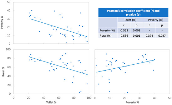 5.3.2. Correlations among Toilet Availability, Poverty, and Rural Population Percentages