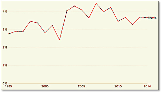 Nigeria’s Government Healthcare Expenditure between 1995 and 2014 as a component of social spending. Source: Author.