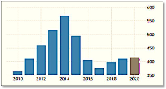 With a thriving formal and an expansive informal sector currently employing over 60% of the working population [5], Nigeria’s economic prospects appear bright. However, she is beleaguered with chronic economic and political mismanagement, attested to by the failures of erstwhile economic reforms. Despite her unique complexities as a developing country, Nigeria’s economy’s remarkable growth is puzzling. Annual growth levels averaged 7% (from 2002 onwards) and 12.7% (2012) [26,35,36], peaking in 2015 at 14% (see Figure 5 and Figure 6) [30]. These results were, however, necessarily not because of sound economic management on the part of government, especially given that the Nigerian economy is still mainly agrarian [37]; the explanatory factor could be attributed to developments in the extractive sector (oil and gas exploration), which as the mainstay of the economy accounted for over 70% of government revenues and over 40% of GDP [38]. As the leading African oil and gas producer, Nigeria also has Africa’s largest oil and gas reserves and is the world’s fifth biggest net exporter of LNG (Liquefied Natural Gas) [29]. However, persistent political economy issues (multidimensional poverty, inequality, extreme deprivation, class divisions, and political uncertainties), have hampered Nigeria’s economic progress. Since 2015, Nigeria’s current political leadership have similarly struggled to improve the social contract and appeared inept at addressing societal challenges.