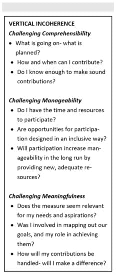 Thus, challenges for vertical coherence can be summarized in line with the three dimensions of coherence (see Figure 1). Challenges with comprehensibility can arise in respect to insecurity about how to address the challenge, but also in respect to the decisions- and implementation process itself. This includes knowledge about how and when to participate to what means, how contributions are followed-up and knowledge about contextual matters that set the boundaries for actions (such as available resources in the municipality). Challenges with manageability arise in respect to finding the resources to participate in and/or carry out activities; and in respect to how opportunities for involvement are designed and communicated especially to people and groups in vulnerable situations. Challenges with meaningfulness manifest themselves as lack of motivation to participate, or to use the developed resource after the implementation is concluded. Motivation is often spoiled by perceptions of not being able to make a real difference, either because contributions are not followed up or because one does not see the relevance of the measure or activity; or because one lacks information to make sound contributions.