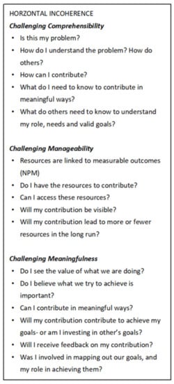 Challenges in multi-sectoral collaboration are often summarized as matters of “silo-thinking”, characterized by fragmented knowledge, goals, and responsibilities that damage for motivation and poses obstacles for collaboration processes [15]. In a way, a lot of these challenges could be described as “incoherence” (see Figure 2); according to the salutogenic framework.