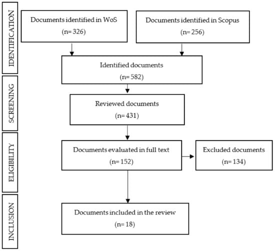 As mentioned above, the procedure for obtaining the sample was divided into four distinct stages (PRISMA): identification, screening, eligibility, and inclusion [20]. Thus, in the first stage, identification, the search equation was established in both databases, discovering a total of 582 documents (326 in WoS and 256 in Scopus). In the second stage, screening, after eliminating duplicates (n = 151) the researchers applied the selection and exclusion criteria in the WoS and Scopus filtering options, excluding 450 documents. At the eligibility stage, a thematic content analysis was performed by reviewing all full-text documents (n = 152), excluding 134 documents. Finally, after the review, in the inclusion phase, 18 articles were selected that were relevant to the purpose of the study. Figure 1 shows the flow chart of this process.