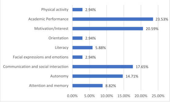 Among the benefits of using AR with these students, we can highlight the following (Figure 3): academic performance (23.53%), motivation (20.59%), communication and social interaction (17.65%) and autonomy (14.71%) are the main advantages of using AR with students with educational needs.