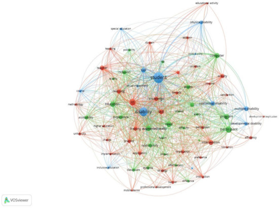 The map produced shows the terms that have been the focus of researchers’ interest in the period 2016–2021 (Figure 3). The analysis revealed that there are three leading themes in this period. The first one addresses the use of AR technology with learners with educational needs (blue colour) with words such as student, disability, inclusive education, intellectual disability, etc. The second theme (red colour) addresses the role of the teacher, i.e., the attitudes and teacher training needed to be able to apply AR in the classroom, highlighting terms such as training, knowledge, skill, professional development, etc. The third theme (green) is related to the use of AR in the field of inclusive education and the benefits it brings, highlighting the keywords Augmented Reality, opportunity, accessibility, effectiveness, etc.