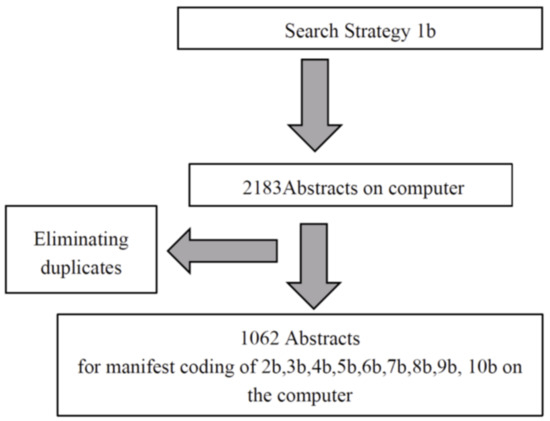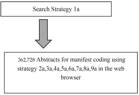 In the first approach, the manifest coding of the abstracts, two procedures were used. Manifest coding using the secondary keywords (Table 1, strategies 2a–9a) was performed for the 362,728 abstracts (Figure 1) within the search pages of each of the databases without downloading any content, the sum of the hits from the four databases for each secondary keyword was recorded, and one number was generated for the result section without eliminating potential duplications of abstracts. For the 2183 abstracts obtained from the non-technical terms, all 2183 abstract were downloaded as part of the citations into Endnote Software and the Endnote software was then used to delete all duplicate abstracts and non-English documents, ending up with 1062 abstracts. All 1062 abstracts were exported from the Endnote software as one RTF file and converted into a PDF. The manifest coding was performed within the PDF using the CTRL F function of Adobe Acrobat software (Table 1, strategies 2b–9b), making certain that the hitcounts reflected the number of abstracts and not the number of hits, as the searches in the web-based database did (Figure 2).