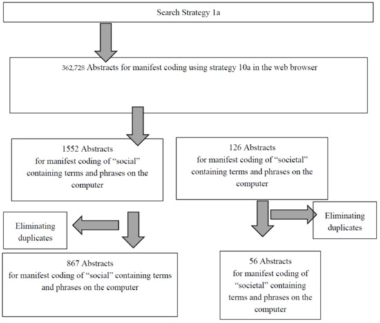 In the second approach (Figure 3), manifest coding using the secondary keywords (Table 1, strategy 10a) was performed for the 362,728 abstracts within the search pages of each of the databases, obtaining 1552 abstracts for “social” and 126” abstracts for “societal”; these were downloaded as part of the citations into Endnote Software and the Endnote software was used to delete all duplicate abstracts and non-English documents, ending up with 867 abstracts for “social” and 56 for “societal”. All these abstracts were exported from the Endnote software as one RTF file for “social” and one RTF file for “societal” and each was converted into a PDF. The manifest coding for “social” or “societal” terms or phrases was performed within the PDF using the CTRL F function of Adobe Acrobat software, making certain that the hitcounts reflected the number of abstracts and not the number of hits, as the searches in the web-based database did (Figure 3).