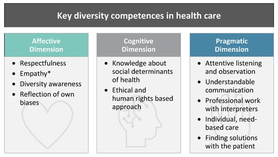 Many scientists and practitioners assume that special competences are needed to deal with the ‘differences’ that migrants add to societies in professional settings. Since societies are shaped by migration, ‘it is no longer possible to imagine debates on the requirement profiles of skilled workers’ without reference to ‘intercultural competence’, which ‘has become a much-used term and a central concept in a wide variety of practical fields’ [8] (p. 13). Educational, linguistic, psychological, economic as well as health sciences reflect on this competence and state demand for it (e.g., [9,10,11] (p. 490)). In the health sciences literature, there seems to be an understanding that a specific skillset is needed to meet the needs of all patients equally (cf. [12,13,14] (p. 225)). However, as in other fields (see [15] (p. 284), [16,17]; for an overview on concepts, see [18] (pp. 413–414)), there is no agreement on what to call this skillset, for example inter- or transcultural competence (e.g., [19,20,21]) or congruence [22,23], cultural competence [24], intercultural safety [25], and cultural humility [26]). There also is no consistency regarding specific skills the concepts include (cf. [27] (p. 45), [28] (p. 255).