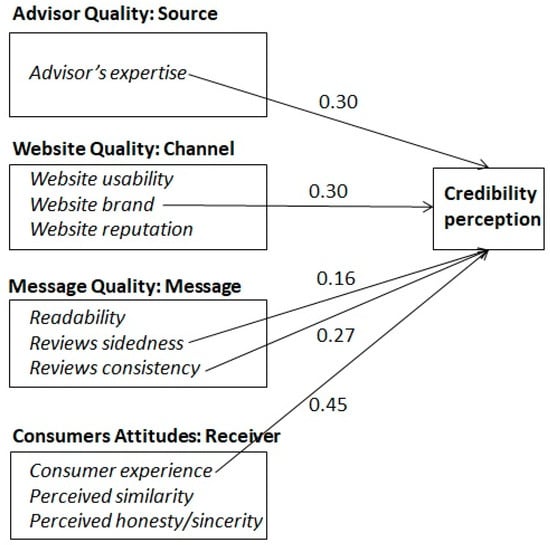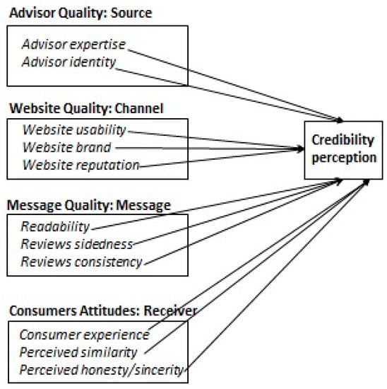 Other important theoretical frameworks have been used in literature to analyse online reviews such as: the Technology Acceptance Model (TAM) and the Theory of Planned Behaviour (TPB). For example, TAM has been used to analyse age and gender differences in user-generated content (UGC) and online reviews adoption intention [21]. This study found that the strongest determinants are: perceived usefulness for males, perceived ease of use for females and older travellers, and expertise for younger travellers [21]. An example of use of TPB was given with the aim to analyse the impact of electronic word of mouth (eWOM) on a tourism destination choice. Results indicated that eWOM has a significant and positive impact on attitudes toward visiting a destination, subjective norms, perceived behavioural control, and intention to travel [22]. Unlike these studies, our model takes into account other determinants more related to the communication process and analysed the interaction of variables related to factors such as source, message, channel, and receiver. This study, in fact, takes into account not only factors related to the message (readability, review sidedness, and review consistency) and source (advisor expertise and advisor’s identity), but also other factors of the credibility process related to the channel; in other words, the website’s usability, brand, and reputation, as well as the receiver (consumer), considering the mediating role of the consumers’ attitudes. These attitudes are perceived honesty and sincerity of the advisor, perceived similarity to the advisor, and consumer experience.