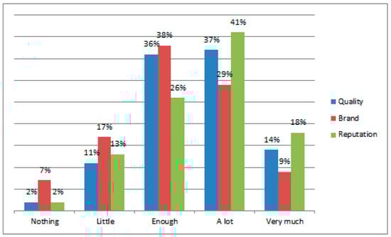 This section of the questionnaire aimed to analyse consumers’ trust related to the four constructs described above: website quality, advisor quality, message quality, and consumer attitudes. The analysis found that concerning the quality construct, the variables that most affected the online trust of reviews by respondents was the reputation of the website (41%), followed by website usability (37%) and brand (29%) (Figure 2).
