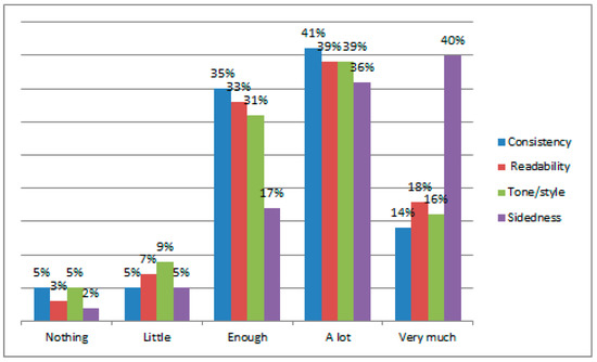 Message quality is characterized by usefulness, accuracy, and importance of the information contained in the message [50]. Quality is a crucial issue for credibility of online information, and for stimulating consumers to make effective decisions on purchases. Gobinath and Gupta [51] observed that if information overload or the information quality is below the average, the consumer’s decision effectiveness decreases. According to Thomas et al. [52], information accuracy significantly affects review credibility. Quality is therefore crucial for effective consumers’ decisions. The review’s readability, sidedness, and consistency are three important variables of the message quality construct.