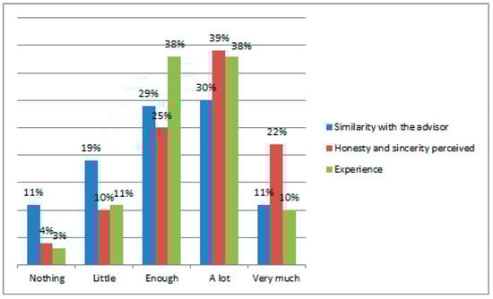 Attitudes are an essential construct for understanding consumers’ decision-making processes [55]. Variables that affect these attitudes are perceived trustworthiness, that is, the perceived honesty and sincerity of the advisor and the perceived similarity to the advisor’s, and consumer’s experience.