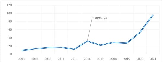 The second stage of reduction identified studies in which an online survey of parents was conducted, yet the focus of the study was not related to digitally mediated parenting. The use of online surveys has, due to necessity, increased during the pandemic, but for this review only studies directly related to parents’ engagement with digital tools or in the digital realm were selected. Additionally, at this stage, studies that did not report empirical research (such as book reviews) and those with fewer than three participants were excluded. At this point, we examined year-by-year publication figures. In effect, articles published between 2011 and 2015 accounted for only 21% of the 326 articles assembled at this stage (see Figure 1). We also identified that there was a significant upsurge in publication intensity from 2016 onwards (see Figure 2). Thus, we decided to focus the scope of the review on the period 2016 to 2021.