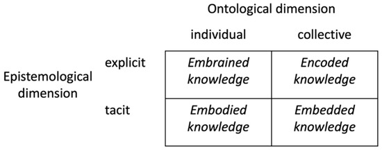 There is also an ontological dimension of knowledge, configured as a matter of individual versus collective knowledge. The first is domain-specific, specialized and accumulated within a single person’s body or brain, which makes it a case of bounded rationality [50]. Since it is autonomous and moves with the individual holding it, the accumulation of such knowledge is precarious [45] (p. 491). Collective knowledge, on the other hand, is held by an organization itself and deposited in its norms, routines and procedures. It is fertilized in communicative action among professionals, and comes to life between, rather than within, individuals [51].