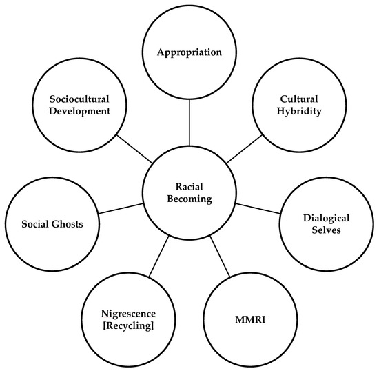 As a framework, racial becoming builds from and extends the work of other critical race theorists, psychologists, anthropologists, sociologists, and historians who have written extensively about the formation of the self and identity [34,35,51,52,53,54,55,56,57,58,59,60,61,62,63] (Figure 1). More specifically, racial becoming incorporates concepts such as appropriation, cultural hybridity, dialogical selves, the multi-dimensional model of racial identity (MMRI), Nigrescence and Nigrescence Recycling, social ghosts and sociocultural development. Each component of racial becoming will be discussed briefly below.