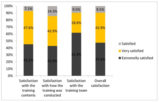 The training program was evaluated from both the trainees’ (n = 42) and trainers’ (n = 8) perspectives. The evaluation of the trainees with the training program is presented first, and secondly, the analysis of the data collected for the SWOT analysis.