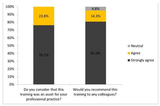 Additionally, the outstanding evaluation that the trainees made of the teaching content and the quality of the trainers might have compensated for the regular perceived disadvantages of the online training [35]. Indeed, Brown [34] states that in cultural diversity awareness courses, the methodology has a positive influence on precipitating some change in cultural diversity sensitivity.