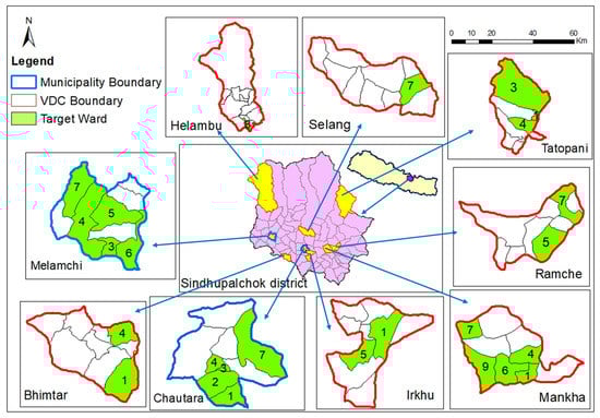 Sampling was performed using the 30 × 7 cluster sampling method used in humanitarian emergencies [25,26,27,28]. It was a two-stage sampling method based on probability proportional to size (PPS). In the first stage, we selected 30 clusters, and 1 ward was considered as a cluster. A ‘ward’ is the smallest administrative unit of the local government of Nepal, i.e., village-level or municipality-level governments. In the second stage, seven households were selected in each cluster. The total sample size was 210 households. The nine municipalities and VDCs selected for sampling were Tatopani VDC (Wards 1, 3, and 4), Ramche VDC (Wards 5 and 7), Mankha VDC (Wards 1, 4, 6, 7, and 9), Chautara Municipality (Wards 1–4 and 7), Irkhu VDC (Wards 1 and 5), Selang VDC (Ward 7), Bhimtar VDC (Wards 1 and 4), Melamchi Municipality (Wards 3–7), and Helambu VDC (Ward 1) (Figure 1).
