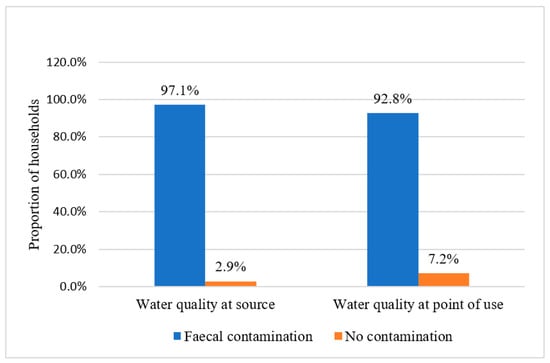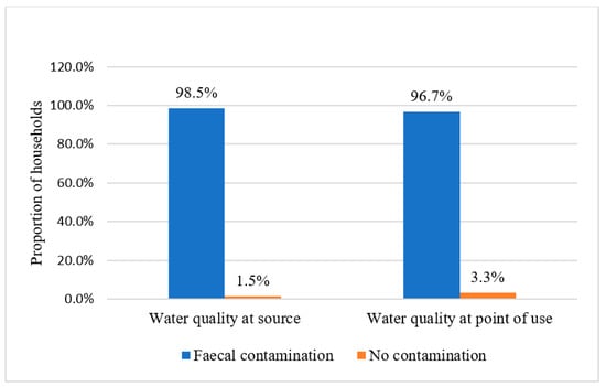 Our study also showed that most of the water samples from the source were found to be fecally contaminated in both seasons. The contamination may be attributed to the lack of source protection and cleanliness. Though many households used toilets in the study area, understanding land-use practice and wastewater management is important to trace the source of water contamination. On the other hand, unsafe and haphazard solid waste disposal observed in the study area might also increase the risk of groundwater pollution [47]. It further contaminates the surrounding environment by increasing the breeding of vectors that carry the pathogens of fecal–oral disease [48]. Moreover, the hydrogeological and hydrochemical changes after an earthquake also affect microbial communities, which increase fecal contamination [49]. Fecal contamination in water sources is always considered as one of the major issues in the post-disaster scenario [50]. For instance, an increase in the microbial contamination of water sources was found in Kathmandu, Nepal, after the 2015 Gorkha Earthquake [3], and in Pakistan after the 2005 earthquake [51]. Similarly, after the Haiti earthquake in 2010, 24.6% of improved sources and 80.9% of unimproved sources of water were found to have fecal contamination in the post-earthquake scenario [52].