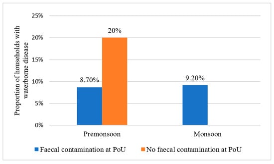 The proportion of households with waterborne diseases was higher among households with fecal contamination at point of use in the monsoon season. During the pre-monsoon season, among the households (n = 195) having fecal contamination of water at PoU, 17 (8.7%) had waterborne diseases. Among the households (n = 15) not having fecal contamination at PoU, 3 (20%) had waterborne diseases. Similarly, during the monsoon season, among the households (n = 202) having fecal contamination at PoU, 18 (9.2%) had waterborne diseases, and among the households (n = 7) without fecal contamination at PoU, none of the waterborne diseases were recognized (Figure 6).