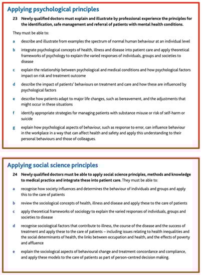 In the United Kingdom (UK), the General Medical Council (GMC) regulates the knowledge, skills, and behaviors that students should acquire during their undergraduate medical training. In 1993, in one of the GMC’s flagship documents, Tomorrow’s Doctors. Outcomes and standards for undergraduate medical education, the GMC (the UK’s medical regulatory body) stipulated for the first time that BSS should be included as a core component in all UK undergraduate medical curricula [14]. In the most recent version of the GMC’s regulations, Outcomes for Graduates [15], that commitment to the inclusion and importance of BSS in undergraduate medical education is explicit (see Figure 1).