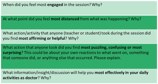 Dikomitis adapted Stephen Brookfield’s Critical Incident Questionnaire (CIQ) [32] and asked NEMS students to complete a CIQ after each SSC module session. “Critical incidents” do not constitute dramatic or unusual events during a teaching session, but everyday occurrences, which, when analysed critically, can improve future teaching sessions [33]. The purpose of such a CIQ was to capture, as Keefer [34] (p. 1) puts it, “critical moments, experiences, or “vivid happenings” that occur in a learning episode”. The adapted CIQ had the session title and date in the header, and it contained 5 questions (see Figure 2).