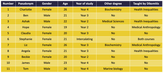 The interview study constituted the second phase of the ethnographic fieldwork and had two objectives: (1) to collect views of NEMS students who had not been taught by Dikomitis and (2) to triangulate the insights she gathered during participant observation. She contacted 34 NEMS students who had indicated that they would be interested to participate in the interview study, and 12 students she had not taught, whose contact details were provided by the medical sociologist that was teaching at the NEMS. Students were approached via a personalized email with the study information and consent form. A total of 11 students agreed to take part in the study (see Figure 3 for details).